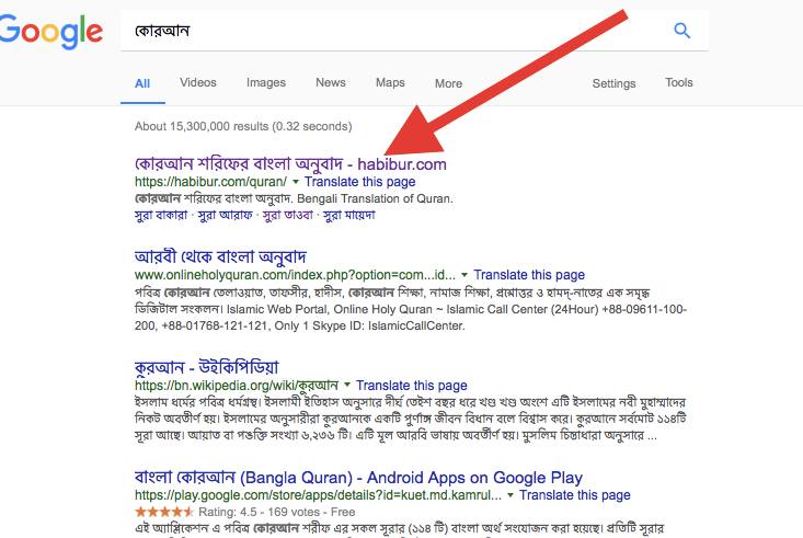 এখন বাংলায় “কোরআন” লিখে গুগুলে সার্চ দিলে habibur.com আসে প্রথম ম্যচ।